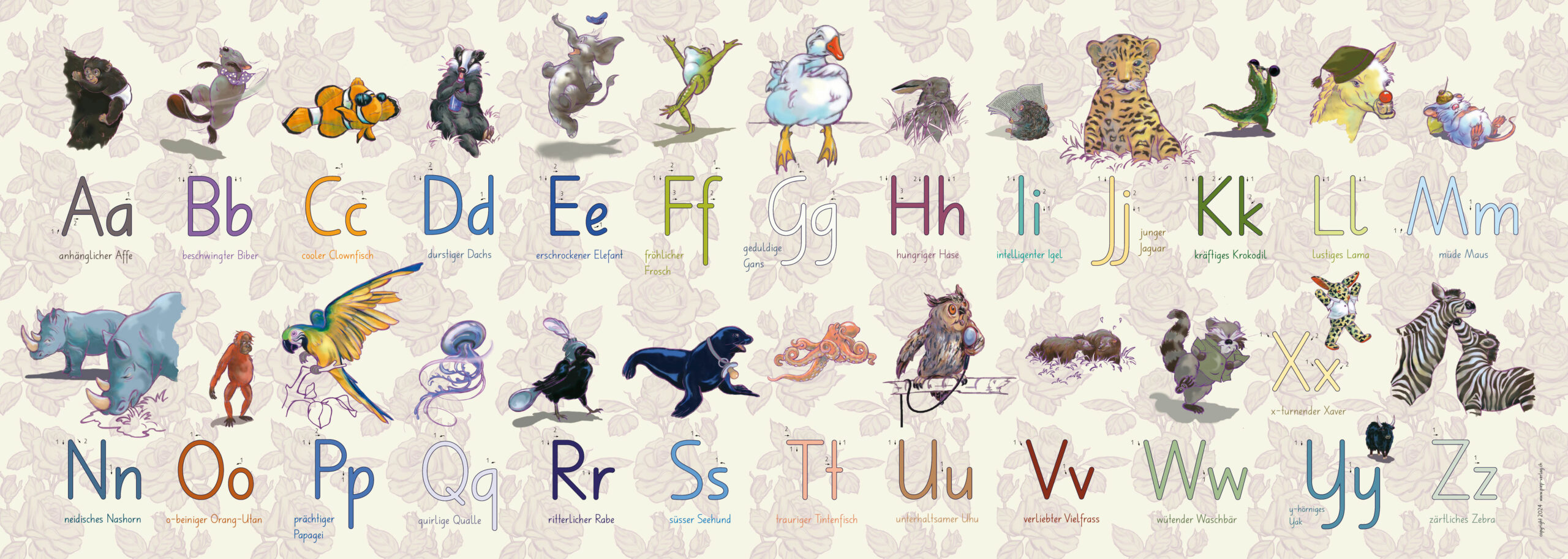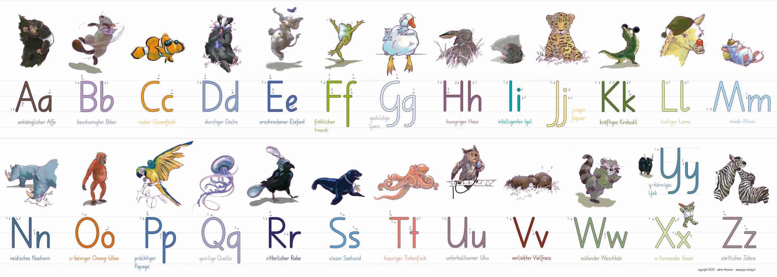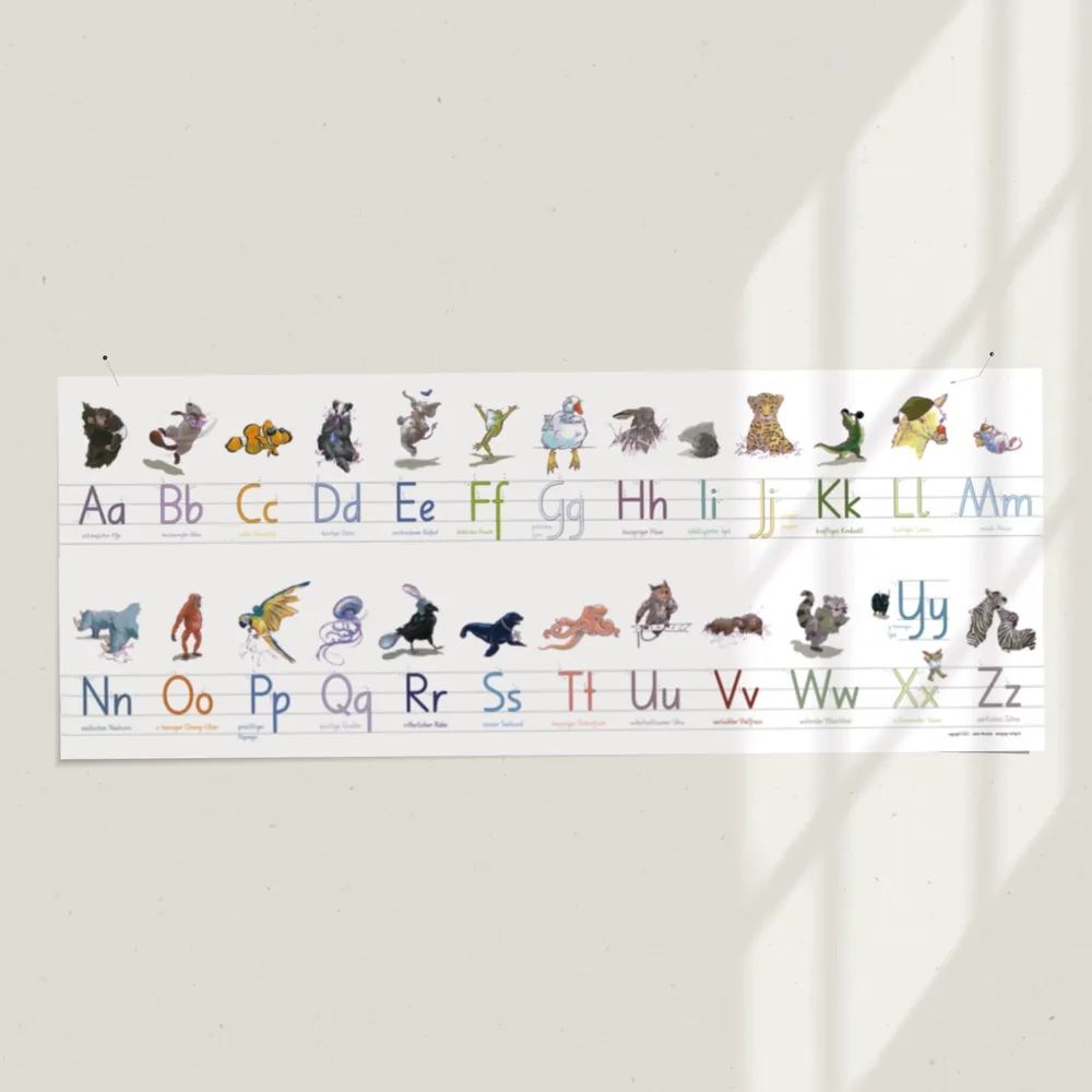 Buchstaben mit Deutschschweizer Basisschrift, vier Hilfslinien und Schreibablauf. Auch hier sind die Tiere mit einem Adjektiv verbunden, dadurch ergeben sich zwei Zugänge zum jeweiligen Buchstaben. (Siehe auch ABC-Plakat oder Buchstabenkette) Format: 42 x 118 cm oder 42 x 236 cm (wenn Sie das Plakat längs halbieren und zu einem langen Band zusammengefügt, je nach Platzmöglichkeiten)