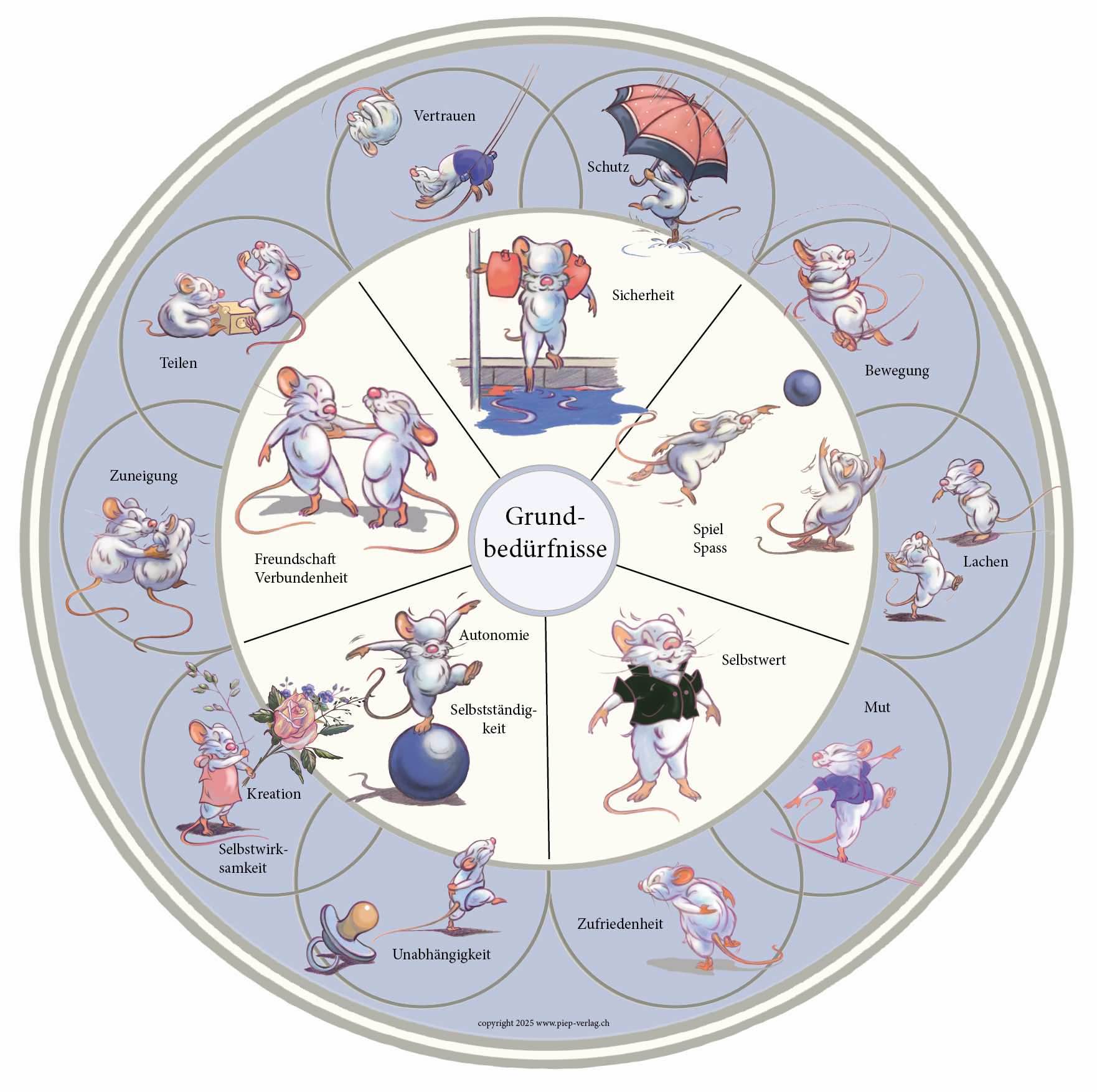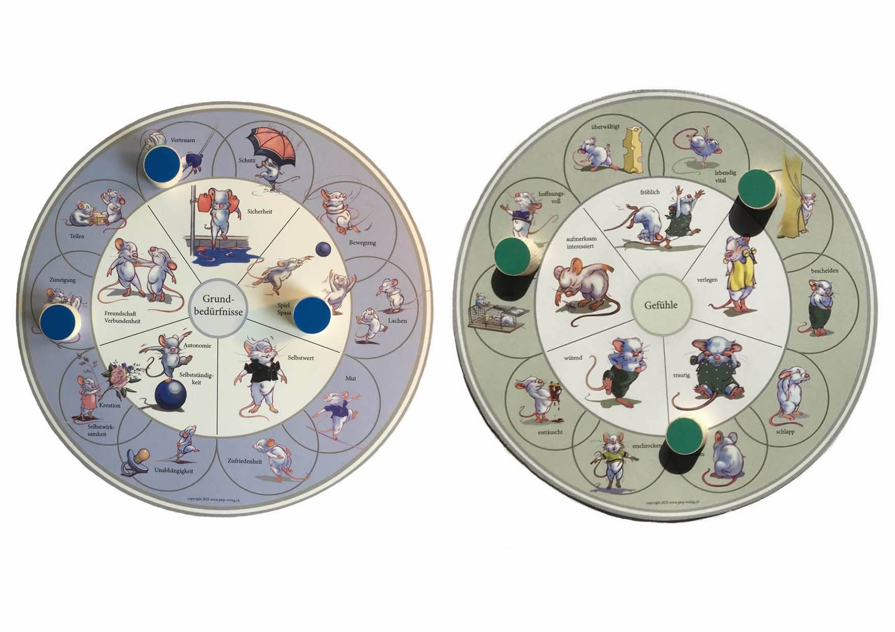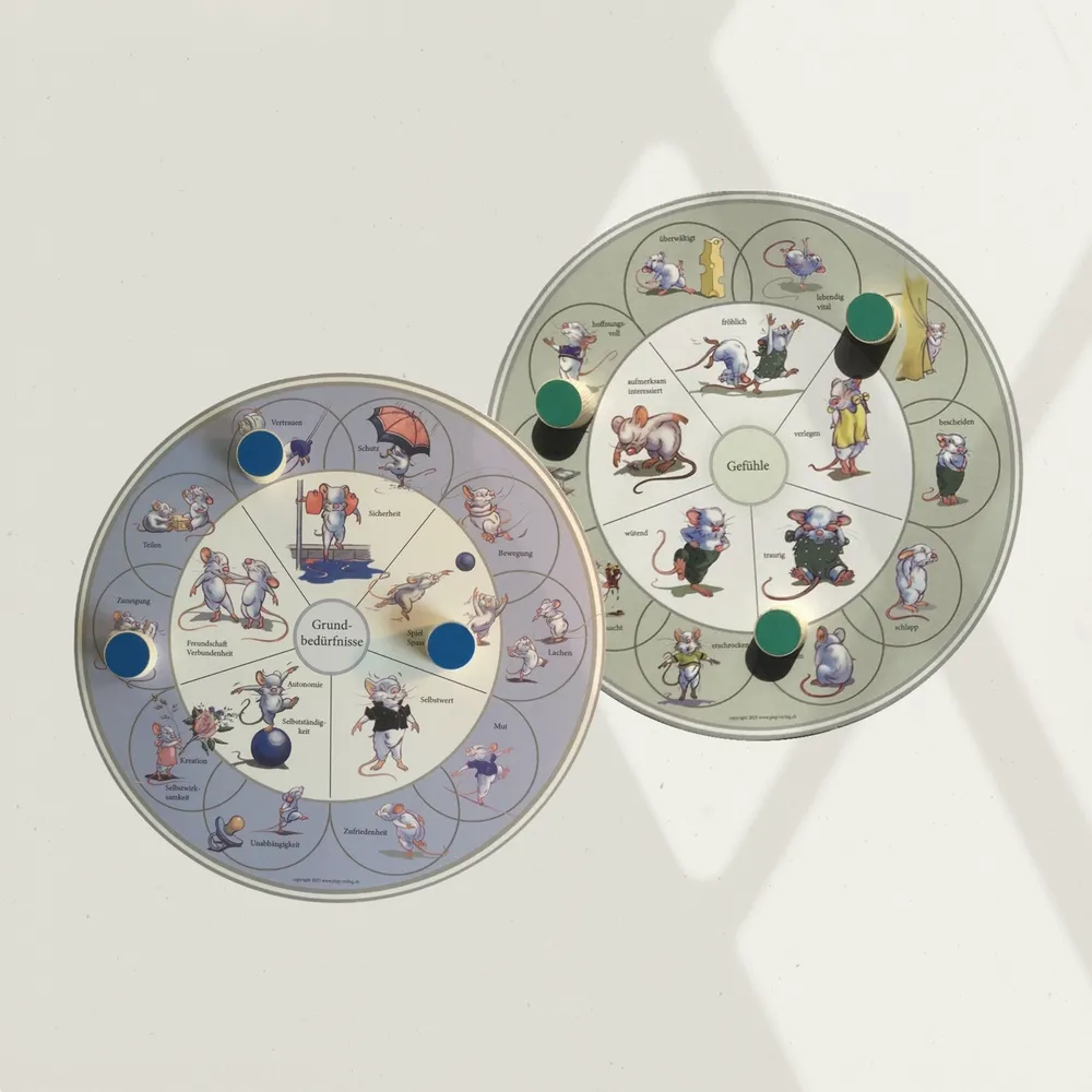 Ein Gefühls- und Bedürfniskreis mit 6 farbigen Holzplättchen und zwei Schmetterlingsrondellen zum Benennen und Erkennen eines Zustands, eines Wunsches, etc.