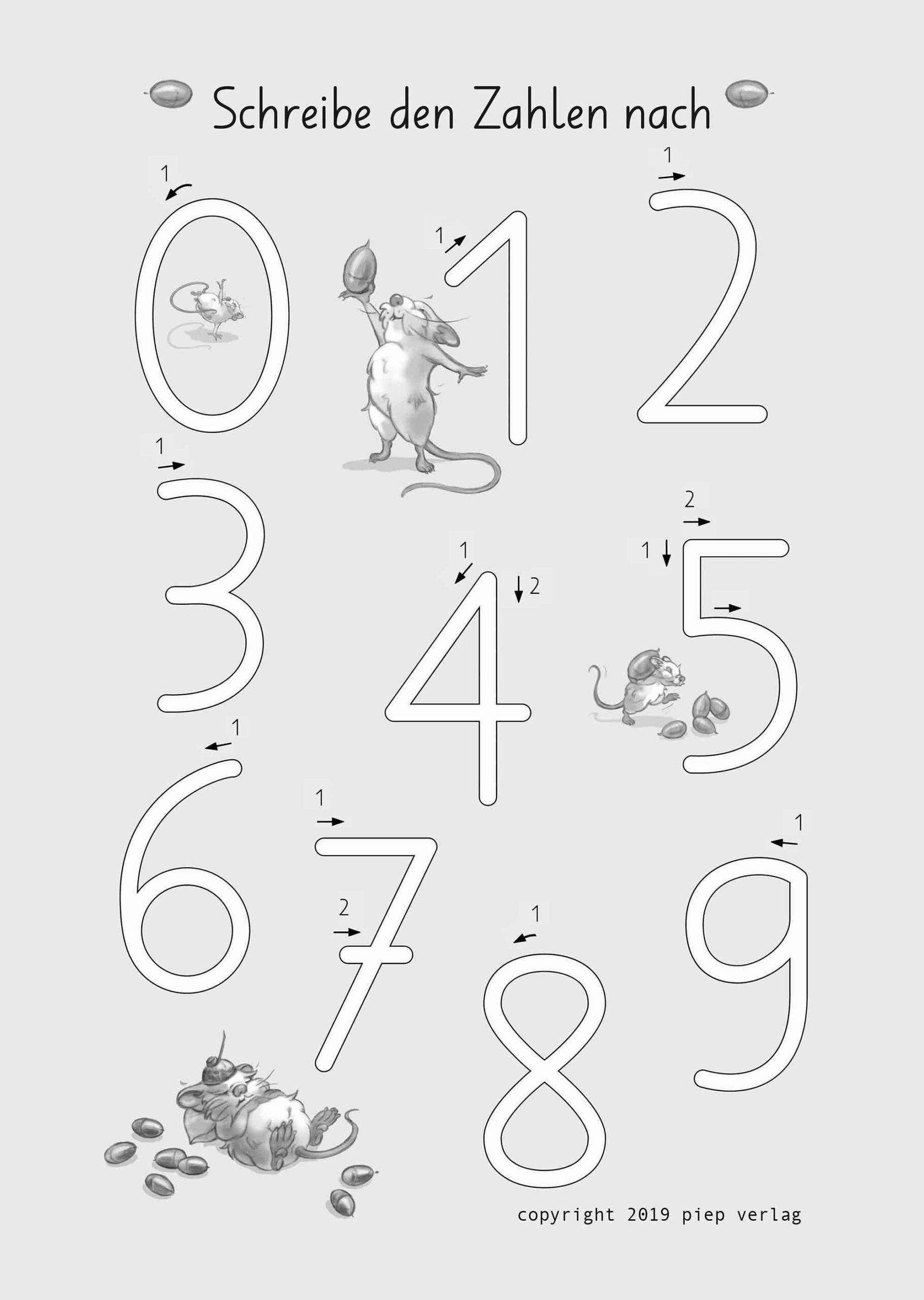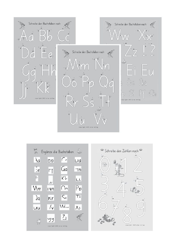 5 Arbeitsblätter zum mehrmaligen Nachschreiben der Buchstaben und Zahlen